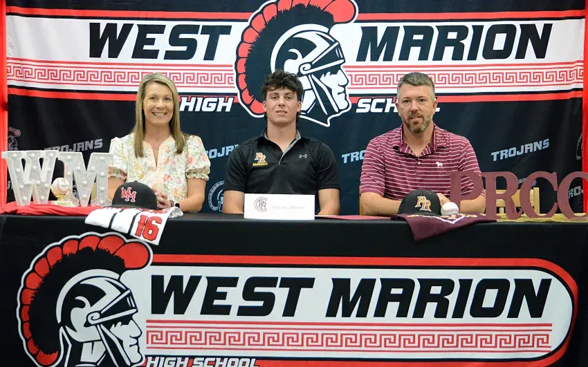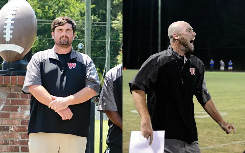 At left, Lane Brady, who has been an assistant at West Marion the past two years, has been promoted to head football coach to lead the Trojans next season. At right, Mason Woodrow, who only lost one district game in three seasons as the head coach of the Trojans, is heading to Petal High School as a