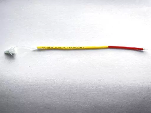 Anglers who catch one can clip off the tag or tags, call the phone number on one side of the tag to report the catch, size, location and other details, and mail the tag or tags to the address on the other side to get the reward. The tag number — AJ followed by five digits — is on both sides.