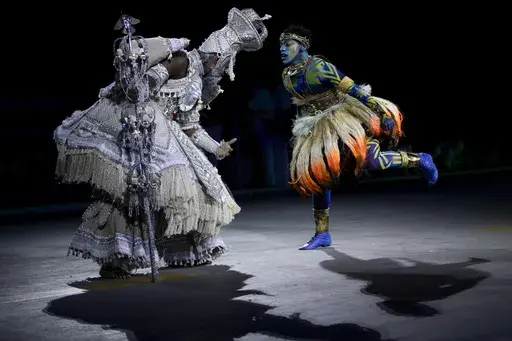 The artists on Monday night paraded with the Unidos da Tijuca samba school, many of them dressed in the samba school's yellow and blue colors, with costumes representing not only the deity, but also the Borel Hill, a community in Rio's north side where the samba school is based. It is often caught in the crossfire between criminals and police.