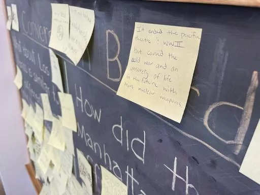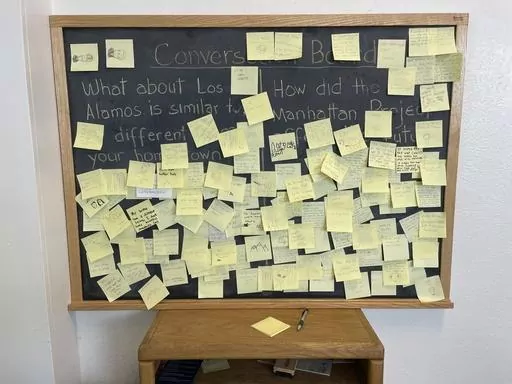 Across the street, rangers at the Manhattan Project National Historical Park visitor center answer questions about where scientists lived and where parties and town halls were held. A chalkboard hangs in the corner, covered in yellow sticky notes left by visitors. Some of the hand-written notes touch on the complicated legacy left by the creation of nuclear weapons.