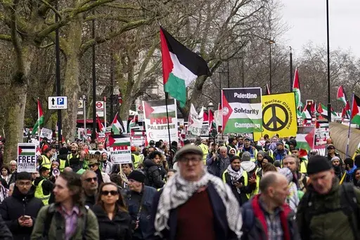 Mass pro-Palestinian protests have drawn hundreds of thousands of people to central London to call for a cease-fire. The protests have been overwhelmingly peaceful, though there have been dozens of arrests over signs and chants that police say showed support for the militant Hamas group, a banned organization in Britain. Police also arrested some right-wing counter-protesters and charged them with inciting racial hatred.