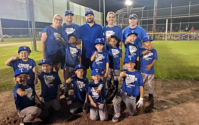 The Carquest Rangers 5/6u Buddy Ball team went 7-3 in the regular season at Dean Griner and won first place in the tournament. The Rangers include, front row, from left, Sykes Loftin, Orryn Morris, Lame Stewart, Kyler Jones and Rizer Meitzler; second row, Beau Newell, Nykee Cain, Sage Williamson, Damien Bass, Andrew Reed and Byron Anderson; back row, coaches Halee and Jeremy Reed, Shannon and Ryan Loftin, Derek Jones and team sponsor Hoyt Jones. Not pictured is team sponsor Jamie Jones.