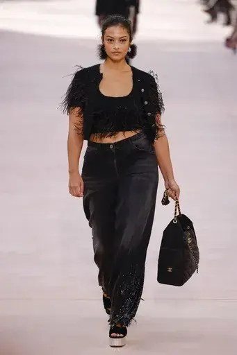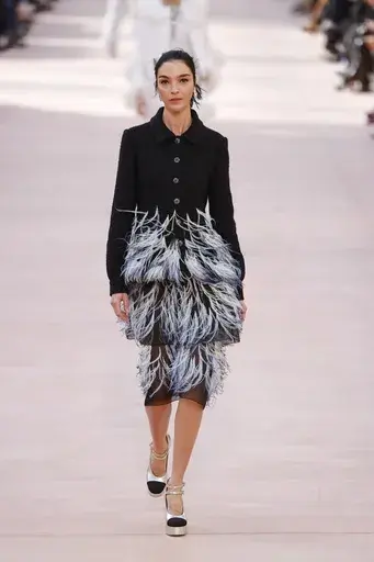 The spring collection delivered many familiar elements from Chanel’s vast repertoire — chiffon capes, slit skirts, embroidered transparent shirt dresses, trench coats adorned with multicolored feather prints, aviator jackets with Peter Pan collars, total pink or blue tweed looks, and the iconic little black dress that Chanel herself introduced to the world. Tweed, jersey, faille, transparent embroidery, sequins, fringe, pastel knits, and sparkling platform shoes all made an appearance, forming a showcase of the house’s signatures.