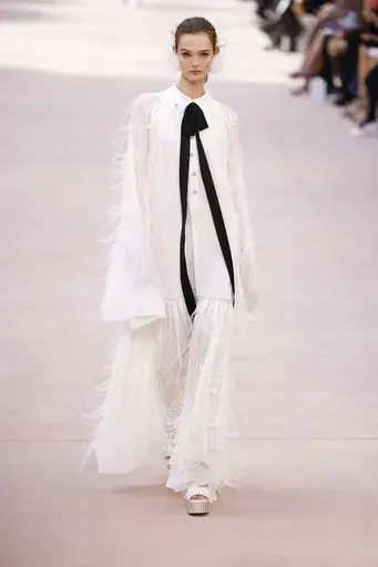 A sheeny striped coat with a curved silhouette opened the show, its adornments and accessories teeming with a kind of futuristic couture—a theme Ghesquière has mastered over his tenure. The coat set the stage for a collection that often intentionally deceived and dazzled the eye, echoing Ghesquière’s penchant for “colliding references” and reimagining the old as new. Giant petal-like fabrics encircled the necks of models, conjuring both South American flair and a nod to punk—the very hybrid aesthetic that makes Ghesquière’s work so unmistakable.