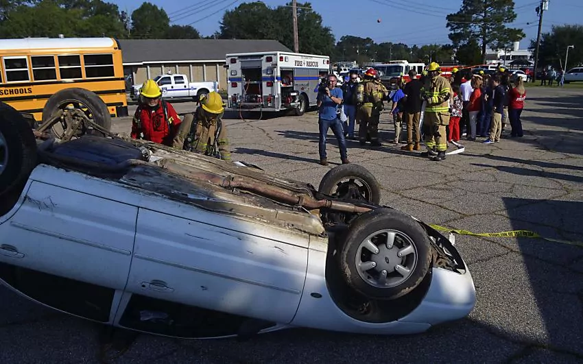 A car collides with a tanker and two buses full of students become involved in the accident causing dozens of injuries and deaths.