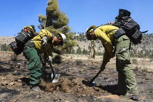Crews nearby were focused on a 100-acre (40-hectare) spot fire that broke away from the main blaze toward hills that overlook nearby homes. One firefighter repeatedly swung a scraping tool as winds howled and smoke swirled through the air to reveal smoldering tree roots. He removed his glove and reached his hand into the ground to ensure it was cool before moving on and repeating the process.