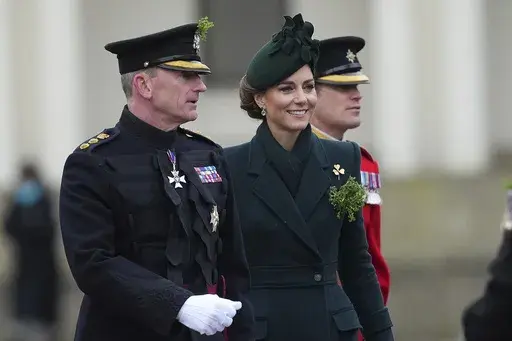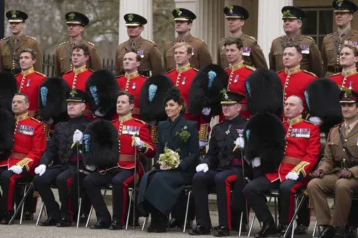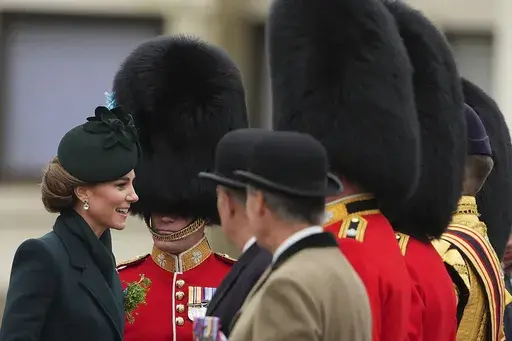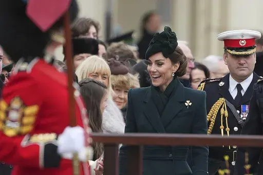 In London, Kate, the Princess of Wales, sported a forest green long coat with matching hat as she marked the occasion with a solo visit to the Irish Guards at Wellington Barracks.