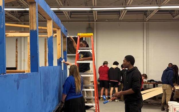 As the structure came together, the project shifted into finishing work—sanding, paint prep, and rolling on the float’s bold blue color. With ladders set up along the trailer and drop cloths spread below, students handled the kind of details that separate a rushed project from a professional-looking result.