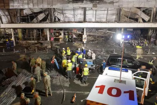 On Wednesday morning, several people still hoping for news of their loved ones stood by the wreckage of the mall. A young woman sat cross-legged on the ground and wept, concealing her tears with dark sunglasses. Another woman was comforted by one of the psychologists. One, man who did not want to give his name, appeared distressed as he stood staring at the ruins. He had brought yellow flowers to lay at the nearby memorial. “I was in there, I almost died” he said “I shouldn’t have come here, it was a bad idea — I can’t even look at this… I want to kill these Russian scumbags.”