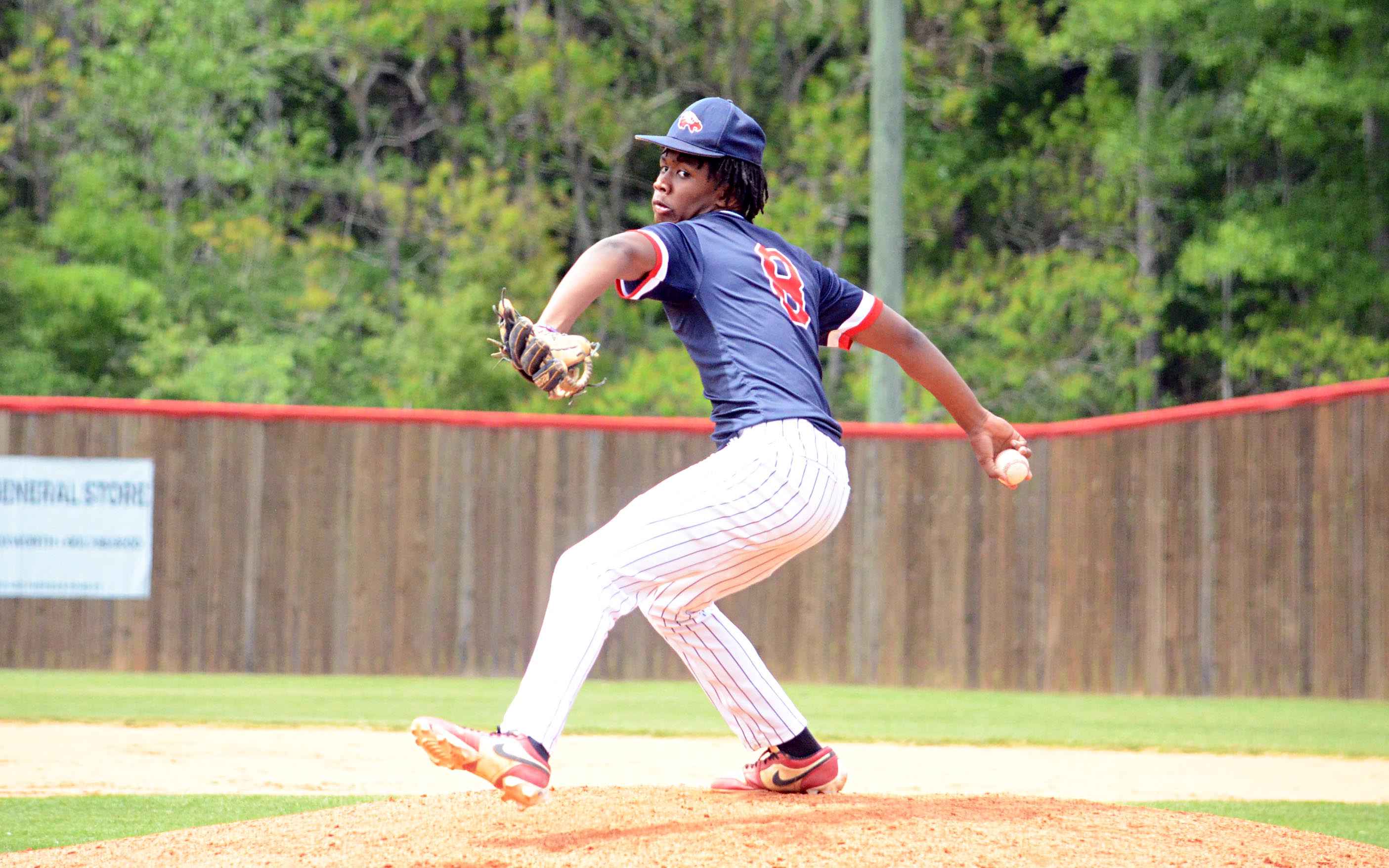 Starting pitcher Shemar Akins weathered an early storm for the Eagles on the mound by shutting Salem down after the third inning in the April 9 meeting at East Marion. He gave up four runs in the first inning and an inside-the-park home run to lead off the third, but he only allowed two more hits in his final four innings of his complete game start, striking out four batters against three walks.