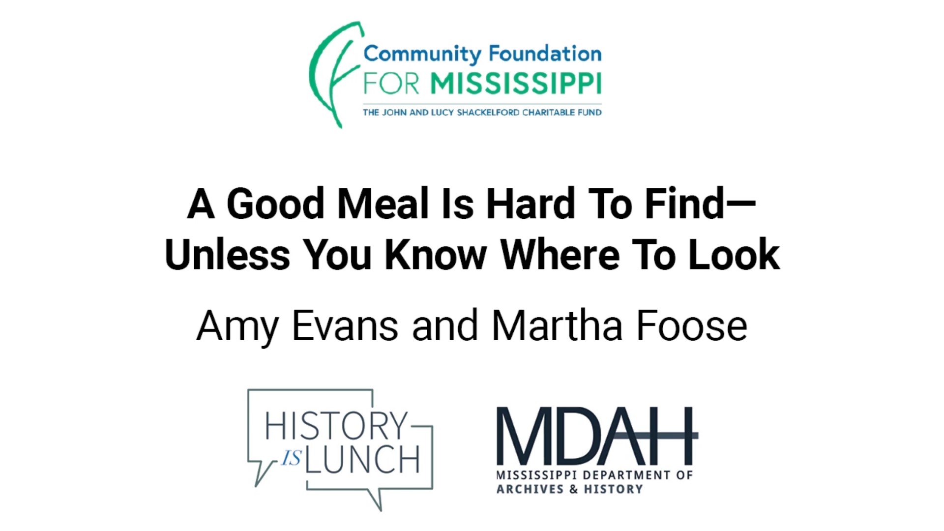 On July 28, 2021, Amy Cameron Evans and Martha Hall Foose presented “A Good Meal Is Hard To Find—Unless You Know where To Look" as part of the History Is Lunch series.