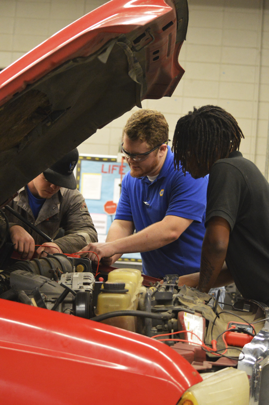 A: I was still managing the Tylertown Napa and working as a mechanic and maintenance man on a farm when I came across this job here. This is my first year teaching. I got into the automotive field when one of my friends told me the automotive instructor, Bobby McGinnis, was really cool. He turned out to be a huge role model for me. I got separated from my mom when I was in Tylertown and needed someone to take care of me, and the Tylertown community stepped in and helped me find a place to stay. My automotive teacher was one of them. He really led me into this field. I really loved it from the start because I’ve always loved taking things apart and putting them back together. I like getting dirty. I actually used to get in trouble sometimes at Napa because I would go work on people’s vehicles in the parking lot when they couldn’t figure it out. I couldn’t help but want to help people. I’ve had so many people help me especially as a child in high school. I really wanted to give back, and that kind of led me into the teaching side of it.