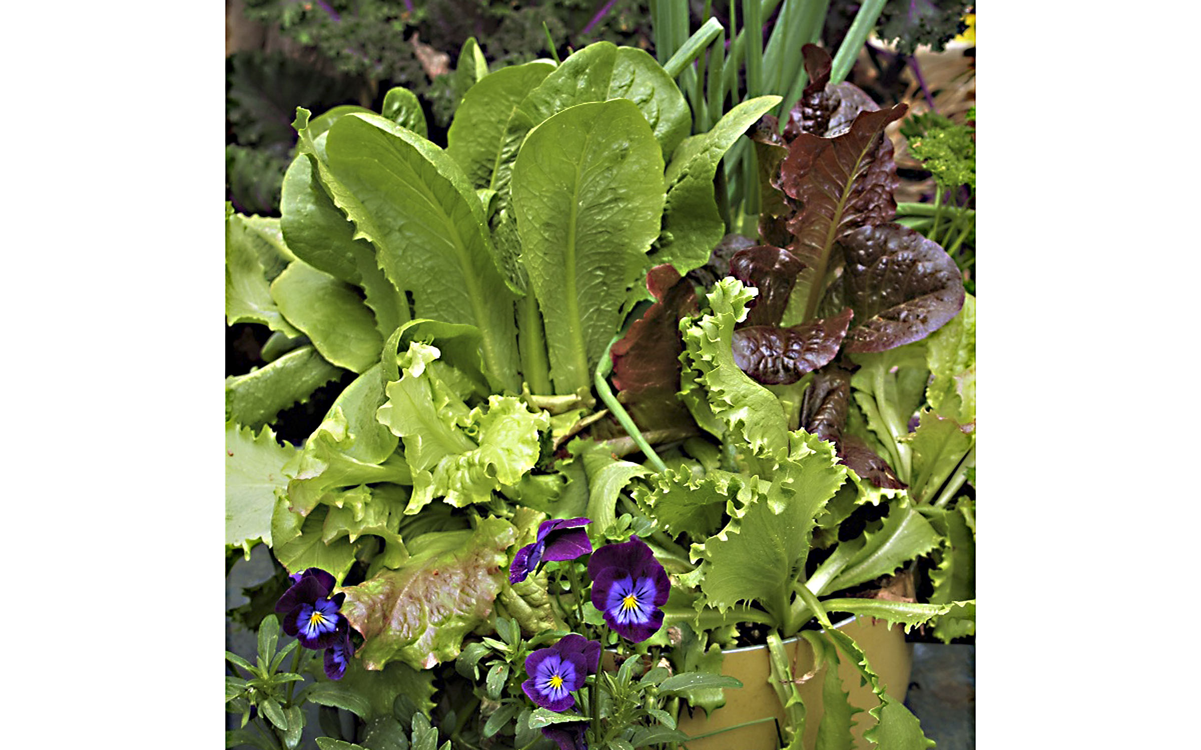I’ve planted lettuces, kale, parsley, pansies, and multiplying onions in an old cook pot with holes drilled in the bottom. Lettuce actually gets sweeter after mild frosts, but won’t take the hard freezes like kale and Swiss chard. When temps dip into the lower 20s I just drag the pot indoors ‘til it warms up a bit.