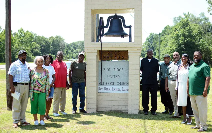 Zion Ridge United Methodist Church members, led by Pastor Daniel Preston (far left), celebrate the rededication of its 106-year-old bell. The bell, which had previously been stolen, was in back yard of Felix Abram (first on the right of the bell) for 50 years. | Photo by Joshua Campbell © Emmerich Newspapers Inc. 2024