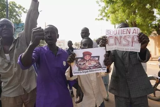 NIAMEY, Niger (AP) — Thousands of people backing the coup in Niger marched through the streets of the capital denouncing the country's former colonial power, and setting a door at the French Embassy ablaze on Sunday before the army broke up the crowd.