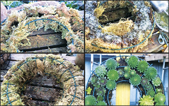First, she said to line a wreath frame with moss. Some add succulents plants; however, she recommends using soil polymers, which are water-absorbing crystals. Using the soil polymers reduces the need to water the wreath as often.