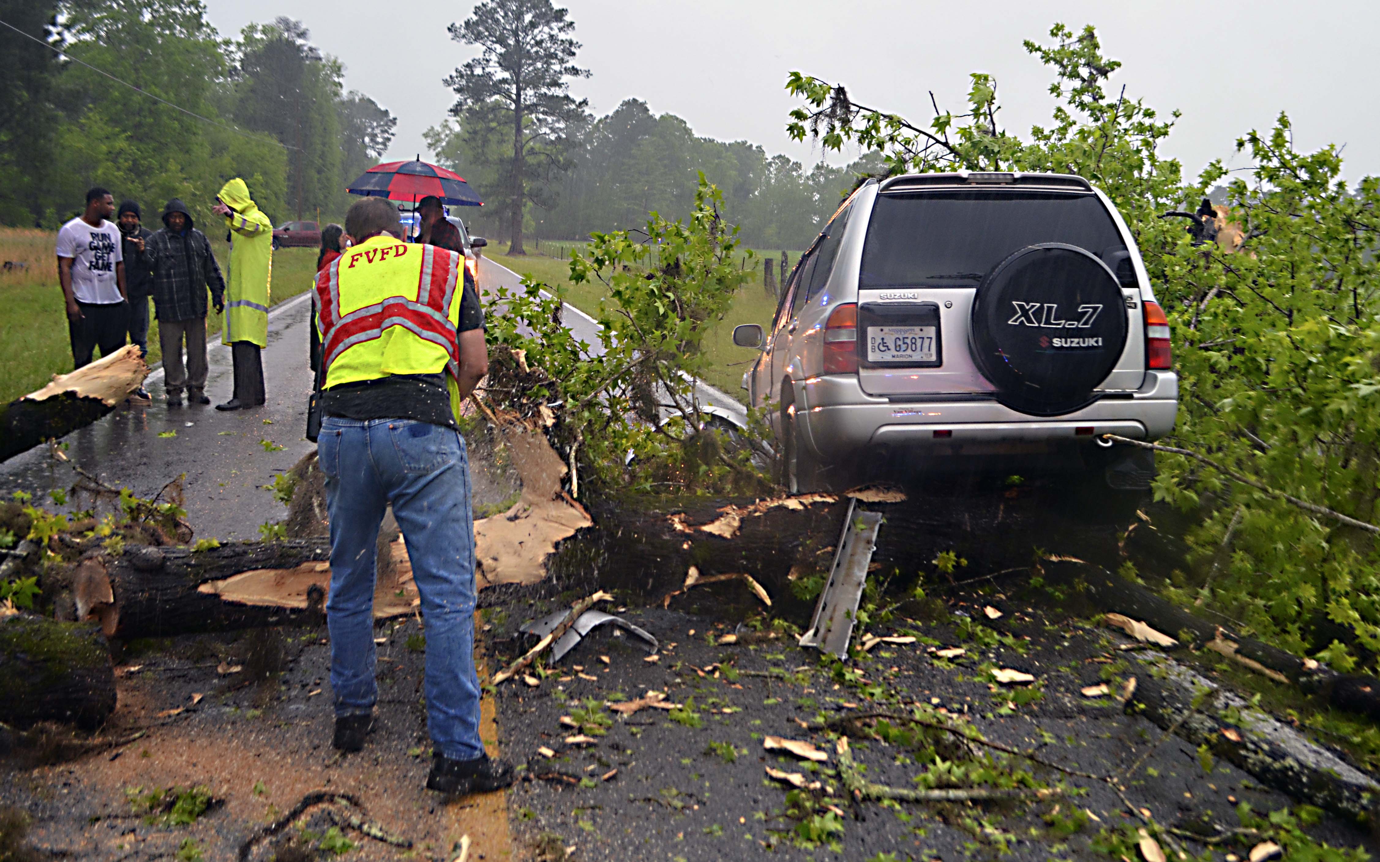 Car hydroplanes on 35 Saturday, lands in trees Storms ripped through Marion County Saturday causing damage to homes, flooding and accidents, including one that killed a man. Shortly before 9 a.m., tornado warnings were issued for neighboring areas including Walthall County after a tornado had touched down in Pike County near McComb, though no warnings were ever issued for Marion County. “When the storm got to the Marion-Walthall line, it dissipated a little,” Emergency Management Director Aaron Greer said. “We had rotation here, but no tornadoes and no warnings. It came back strong as it entered Lamar County.” But the more than 3 inches of rain caused several wrecks, with the most serious one claiming a life Saturday afternoon near 2. Kenneth Gray, 40, of Mt. Olive was killed when his car hydroplaned on Mississippi 35 North near Shivers Road, left the roadway and landed vertically in some trees. Gray and another person were thrown from the vehicle, and Coroner Norma Williamson pronounced Gray dead at the scene. The second person was transported to Marion General Hospital. The Tri-Community Volunteer Fire Department responded along with the Marion County Sheriff’s Office and AAA Ambulance Service with the Mississippi Highway Patrol. A complete report of the accident was not available as of deadline Tuesday from the MHP. Another area man is lucky to be alive after a tree fell on or in front of his vehicle on Mississippi 43 near Mail Route Road around 10 a.m. First responders and firefighters from South Marion, Pine Burr and Foxworth used chainsaws in the pouring rain to remove the tree from around the vehicle. The driver, whose name was not immediately available from reports, was checked by AAA Ambulance Service at the scene, but he did not appear to have any major injuries. Winds caused damage throughout area, knocking down trees and power lines. The Columbia Fire Department responded to a power line that had fallen on Broadmoor Avenue and was smoking. Crews from Mississippi Power worked to repair the downed line, which caused some outages in Columbia. Shortly after the call of the lines down, Columbia Fire Chief Jeff McKenzie was forced in to action at his Ridgewood Drive residence as a tree fell on it. “We had a large tree on the roof,” he said. “It was a big mess. We were home at the time, and it shook the house when it hit.” McKenzie said they’re gutting some of the home now. “A lot of people came to help. I appreciate it. Mark Carithers and Justin McKenzie came by right away and then a whole bunch of people showed up. They did a real good job of helping out. It was quite an experience,” he said. The Columbia Fire Department, meanwhile, was busy answering calls such as the line down. “The guys were busy running with calls,” he said. “I would have been with them on Broadmoor, but I was dealing with things at my house. It was something.” Around 10 a.m., Pine Burr Volunteer Fire Department firefighters were responding to Pine Burr Road about a mile off Mississippi 13 for reports of trees down. Firefighters and others cut trees out of the roadway. They also responded later, around 5:25 p.m. to Pine Burr Road for more trees that had fallen. In addition to the fatal crash on Mississippi 35, the Tri-Community Volunteer Fire Department also responded to and accident at Pittman and Cedar Grove roads. No injuries were reported in the 11 a.m. incident. Greer said that officially, Columbia received 3.12 inches of rain. “I’ve heard unofficially of reports of four to five inches in the county,” he said. Across the state, two tornadoes had been confirmed as of Monday, an EF-1 in Rankin County with winds of 90 mph, and an EF-2 in Lauderdale County with 115-mph winds. Additional National Weather Service surveys are ongoing. Lauderdale County was the heaviest hit with 45 homes, 14 apartments, and four public buildings receiving major damage or being destroyed. More than 70 homes received minor damage as did 15 businesses and eight public buildings. There was one injury and up to 60 residents were displaced. The Mississippi Emergency Management Agency has deployed staff to Lauderdale County to assist. In George County, high water rescues were performed by emergency officials for 81 people who were attending an event at an ATV recreational park when floodwaters rose rapidly. In Rankin County, one home was destroyed.