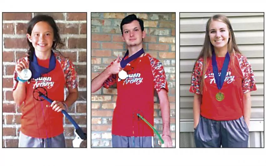 Pictured Above: From left, Columbia Academy archers Maci Eggan, Josh Stuckey and Jaylyn Bridgman show off the gold medals they earned at the State Games in Meridian recently. | Photos Submitted