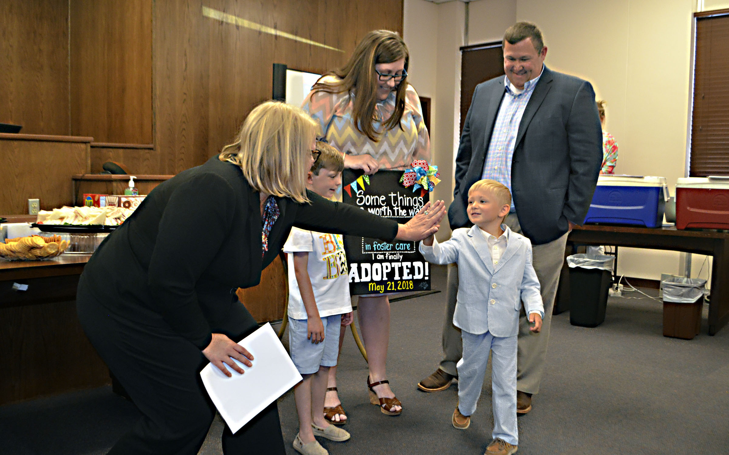 Pictured Above: Chancellor Rhea Sheldon gets a high-five from Gabe Fowler after Gabe’s adoption was completed Monday afternoon at the Marion County Chancery Courtroom. Pictured with Gabe are his brother, Aaron, and parents Katcha and Daniel Fowler of Hattiesburg. The Fowlers have adopted two children and fostered many others from Marion County. | Photo by Mark Rogers