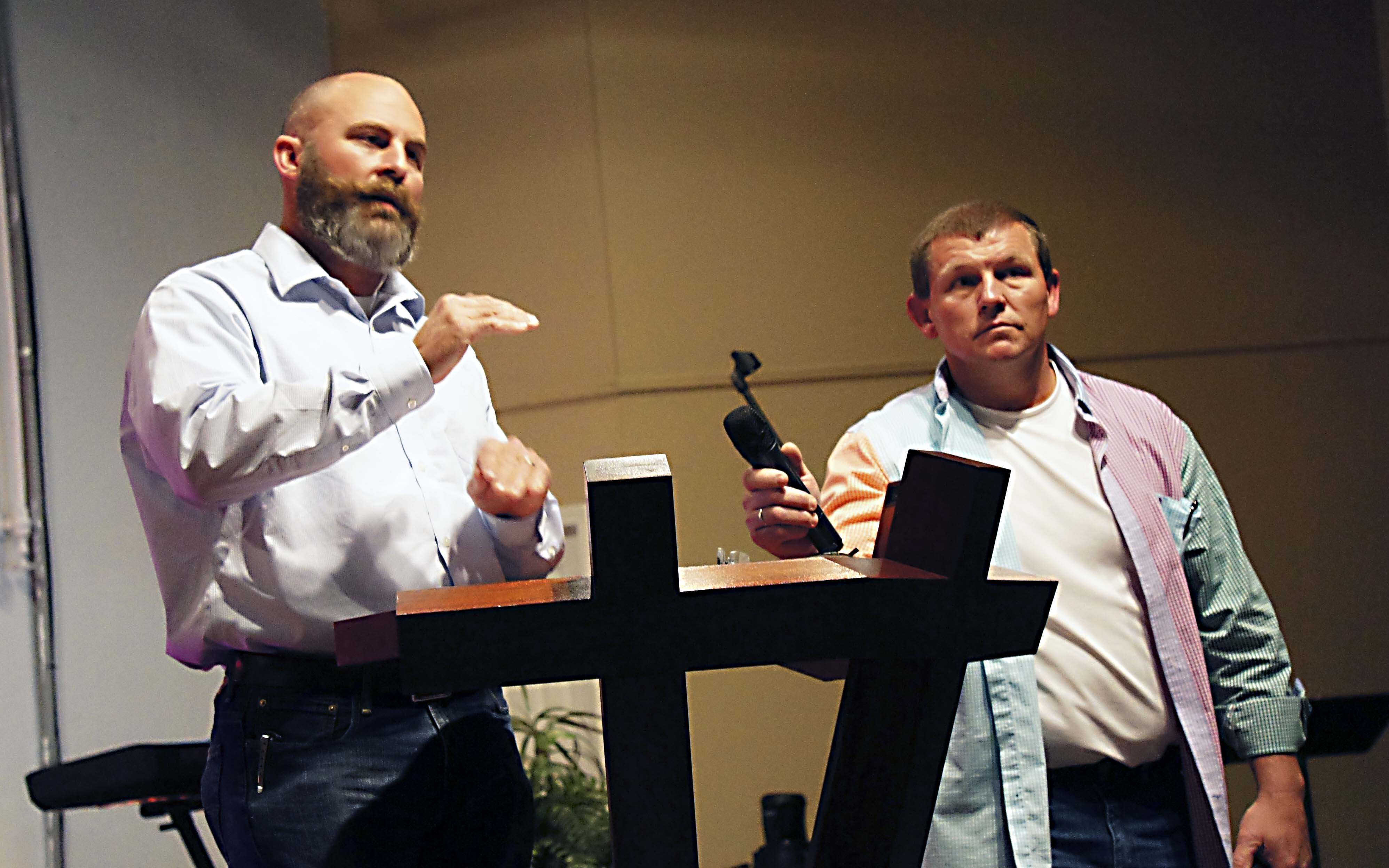 Pictured Above: Jeremy Cooper speaks as Grant McArthur holds the microphone March 8 during an annexation meeting at the Church on Main. They are two of the organizers of an effort to fight the city’s efforts to take in new territory. | Photo by Charlie Smith