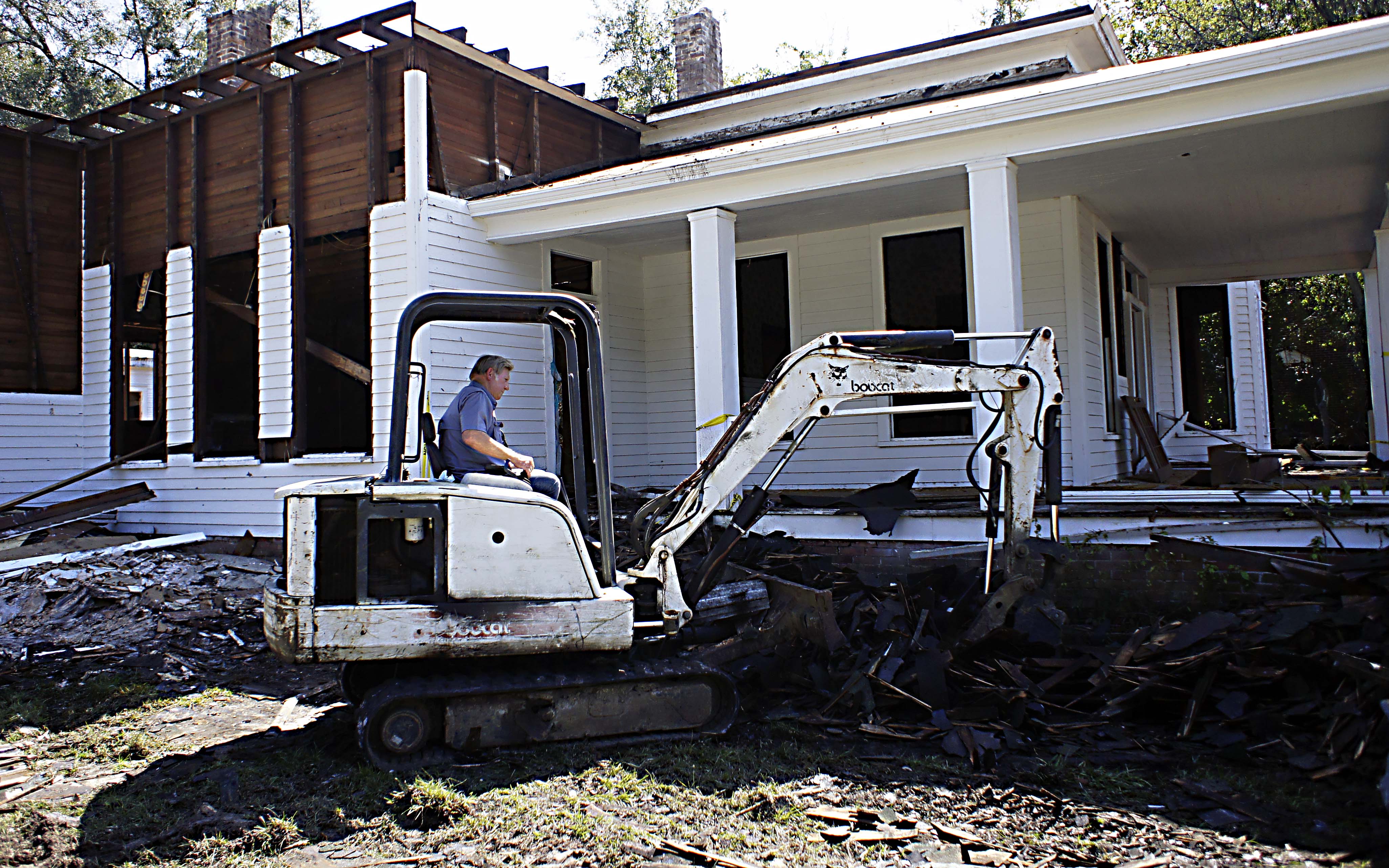 Pictured Above: Will Branch operates a track hoe Wednesday at a house on Mary Street. The Bogalusa, La., resident makes wood floors and furnishings from antique wood he salvages. | Photo by Charlie Smith