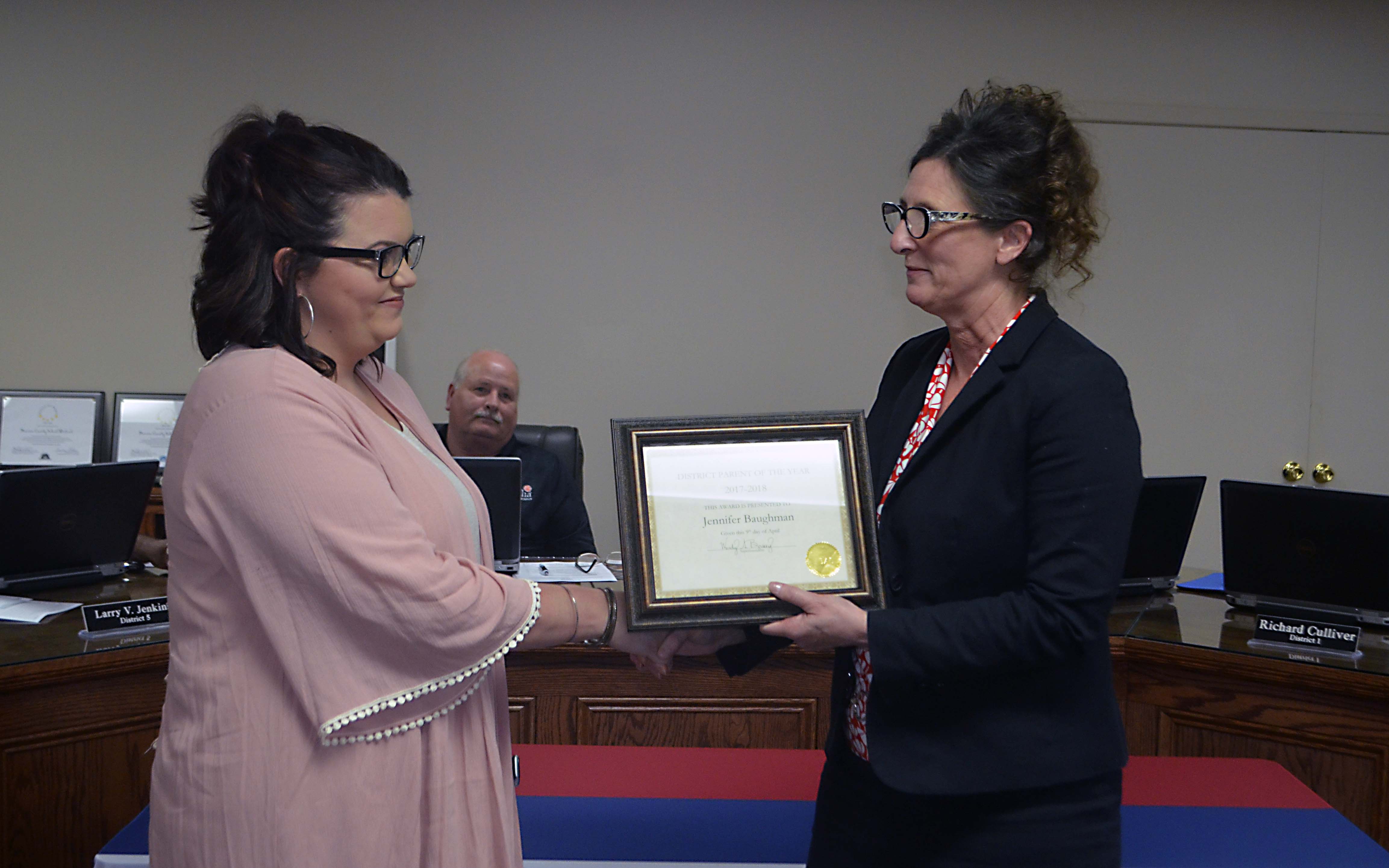 Pictured Above: Marion County School District Parent of the Year Jennifer Baughman receives her award from Superintendent Wendy Bracey during Monday’s school board meeting. Baughman leads the PTO at West Marion Primary. | Photo by Mark Rogers