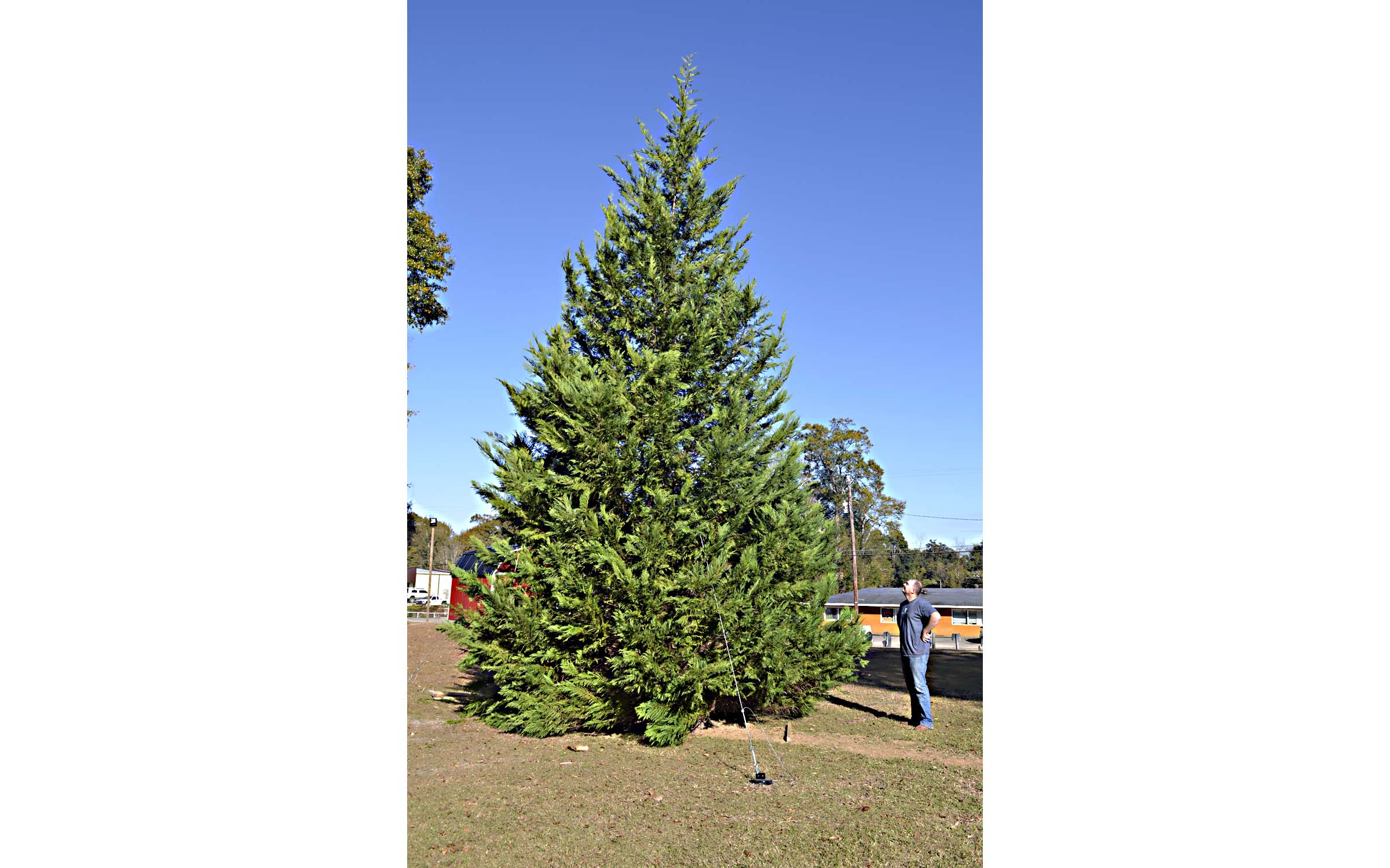 Pictured Above: Main Street Columbia Inc. Manager Nik Ingram looks at the 35-foot Christmas tree Tuesday afternoon. The tree came from Bass Tree Farm and was installed by crews from Pearl River Valley Electric Power Association. | Photo by Mark Rogers