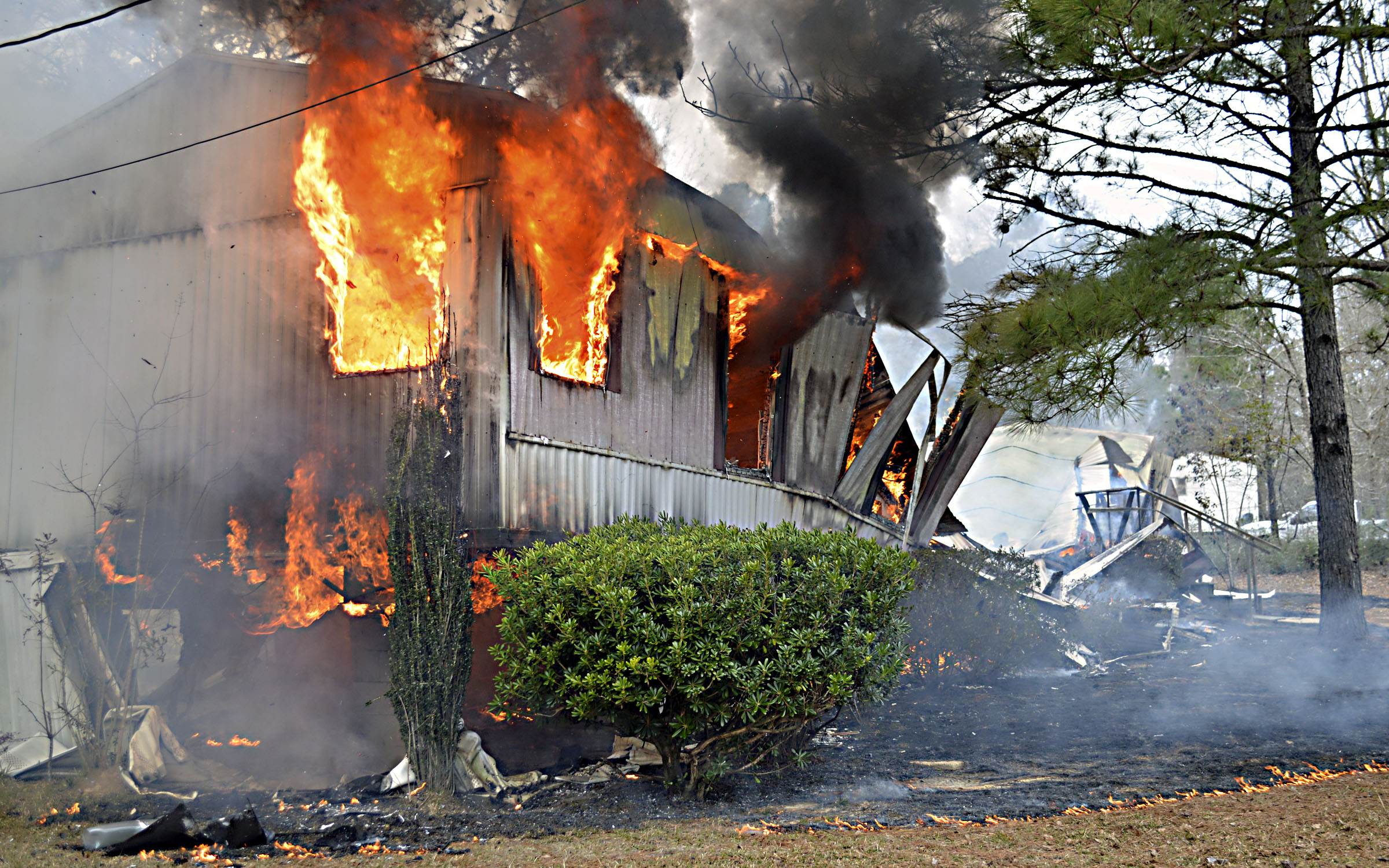 Pictured Above: A trailer at 70 Lawrence Daniels Lane burns Friday afternoon. Flames were already pouring out when Tri-Community firefighters arrived, and they focused on preventing it from spreading out. | Photo by Joshua Campbell