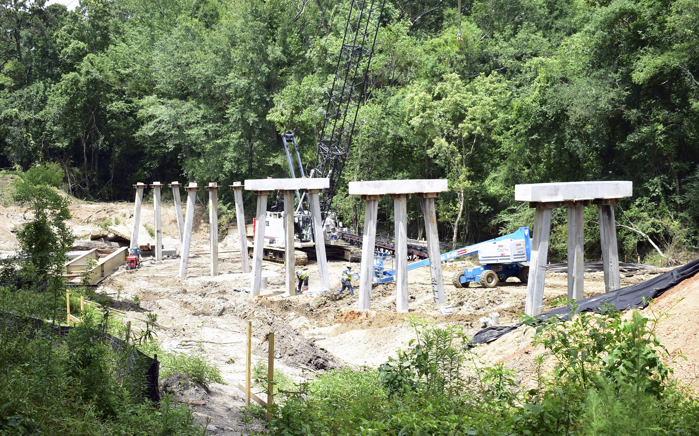 Construction has begun on a pedestrian bridge that will allow riders on the Marion County Recreational Railroad to walk to the Bluff Street Park overlooking the Pearl River.