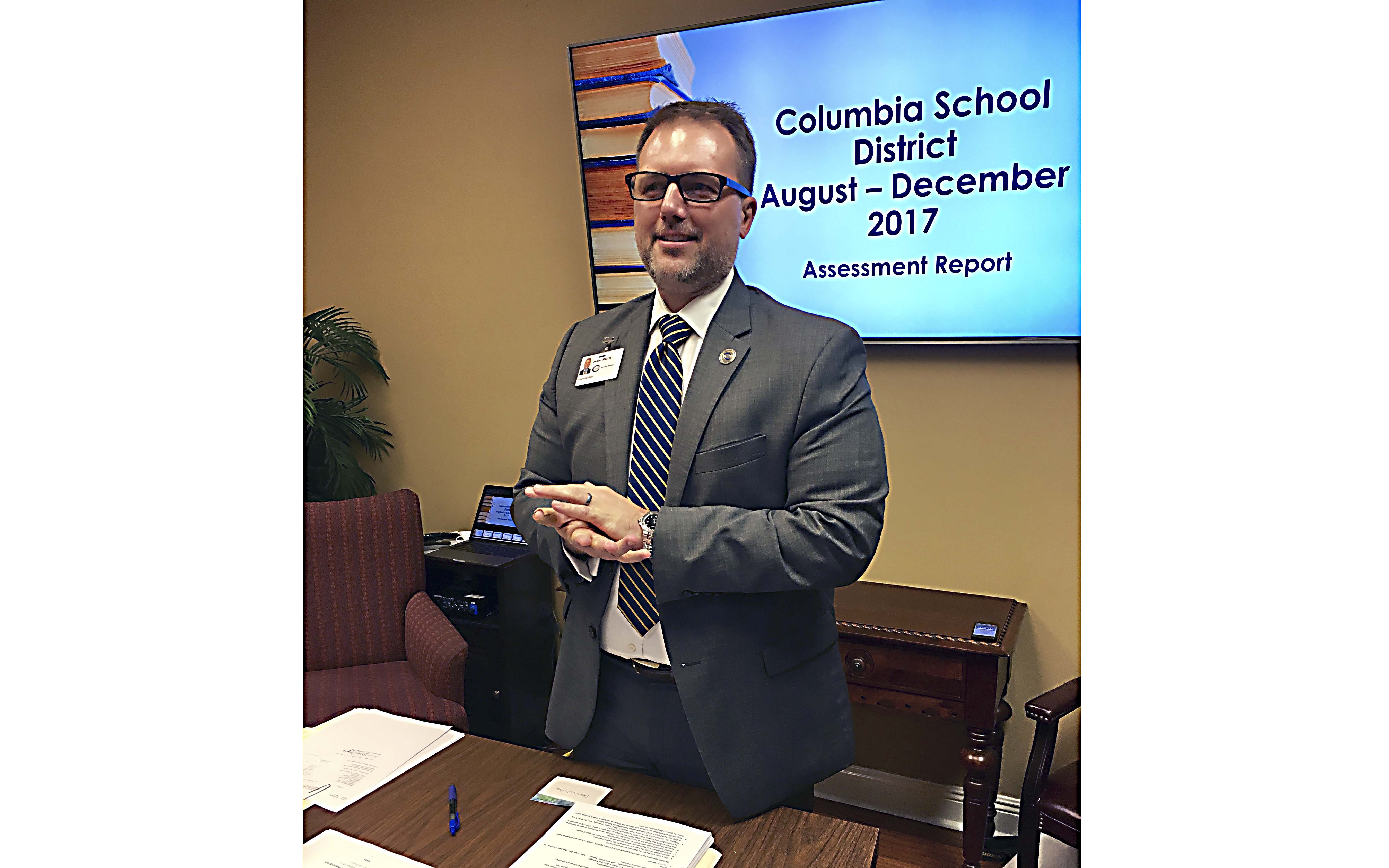 Pictured Above: Columbia Superintendent Jason Harris speaks at a recent meeting. School Board President Marie Shepard said Harris received a “very positive” six-month evaluation. | Photo by Mark Rogers