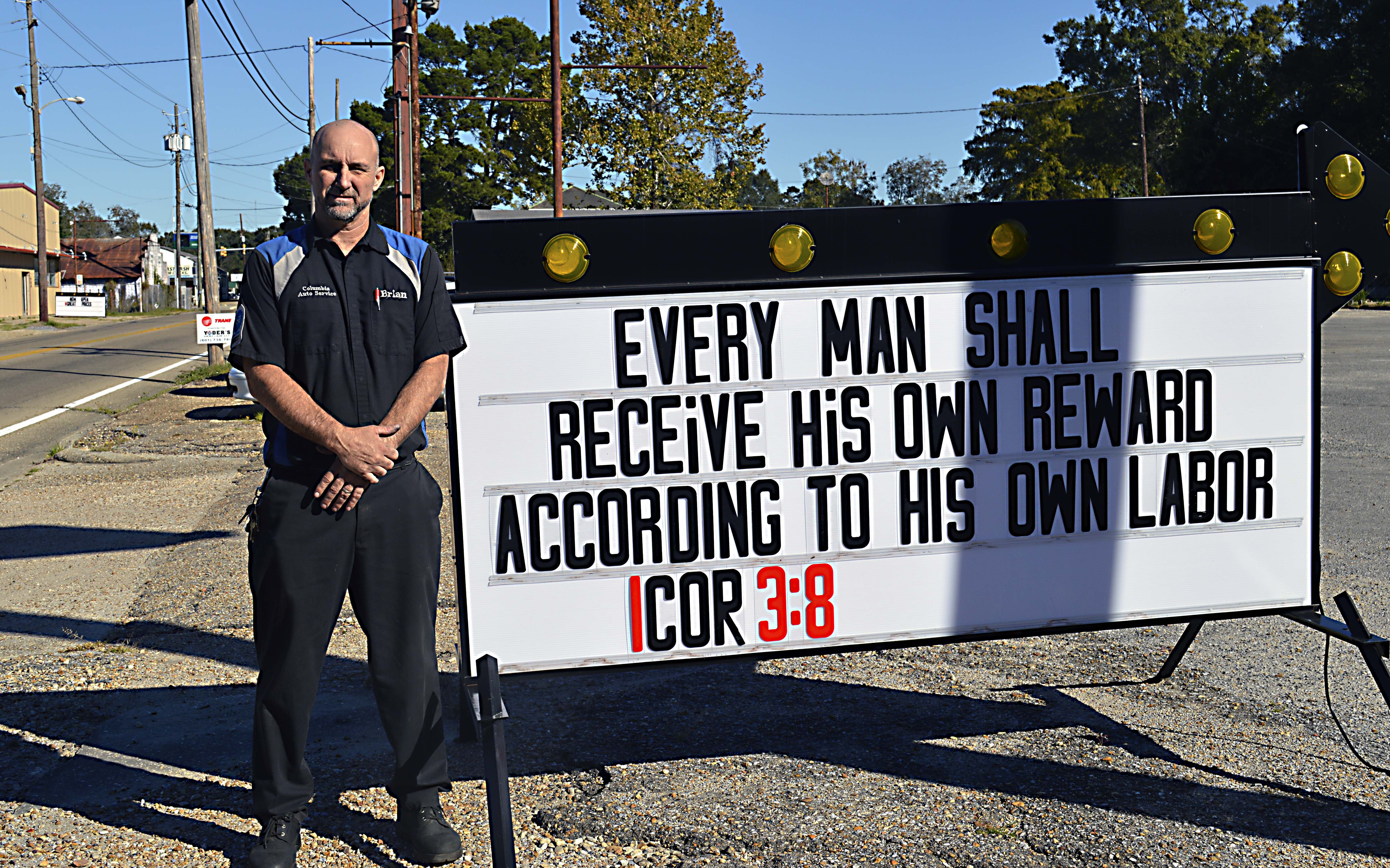 Pictured Above: Brian Roney, owner of Columbia Auto Service, is shown in front of his Bible verse sign. | Photo by Joshua Campbell