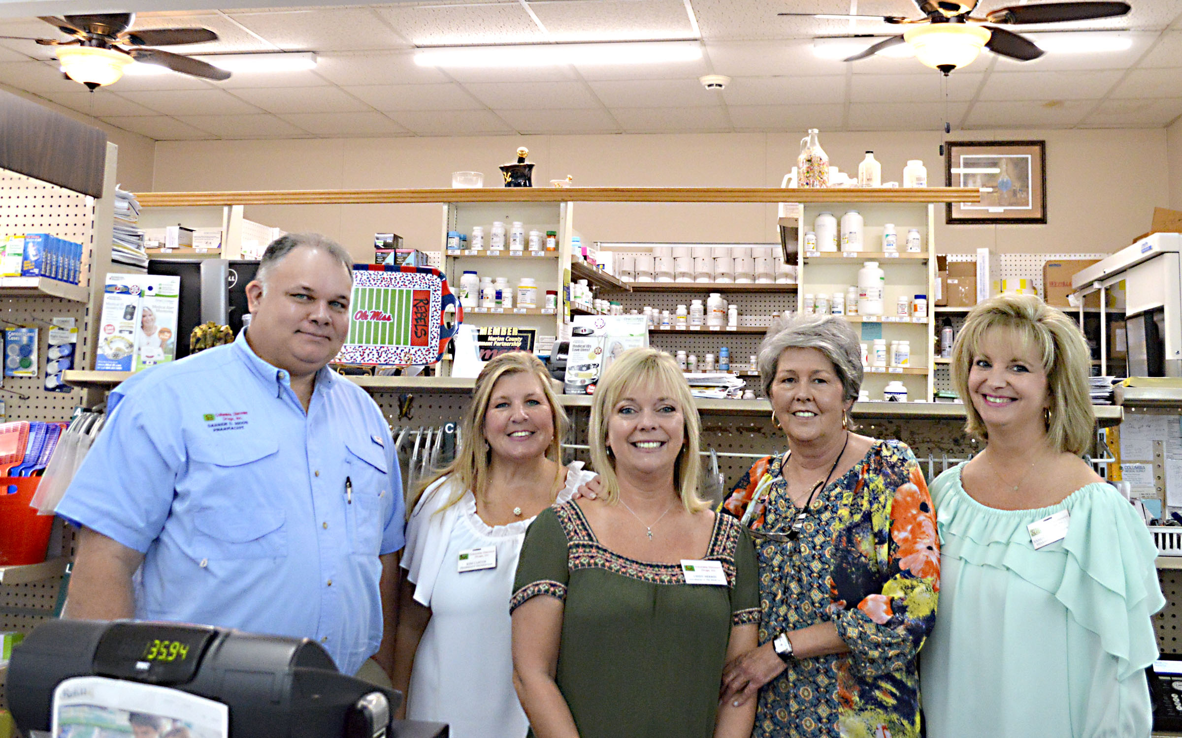 Pictured Above: Columbia Discount Drugs owner Darren Higgs is joined by employees, from left, Kim Carter, Cindy Herrin, Carol Williamson and Sandy Weatherford. | Photo by Joshua Campbell