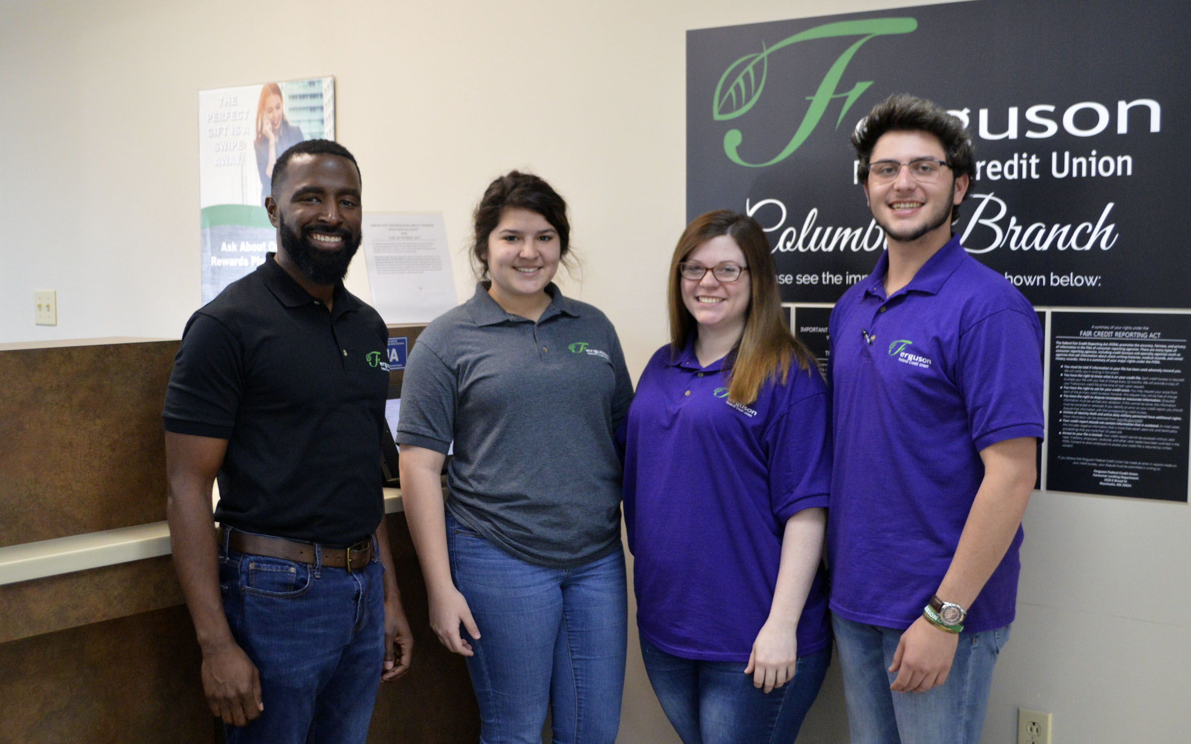 Pictured Above: From left. assistant branch manager Zackery Fortenberry, Erika Alford, Katarina Powell and AJ Russell make up the Ferguson Federal Credit Union team. | Photo by Joshua Campbell