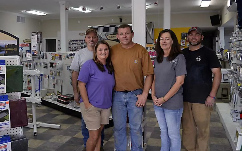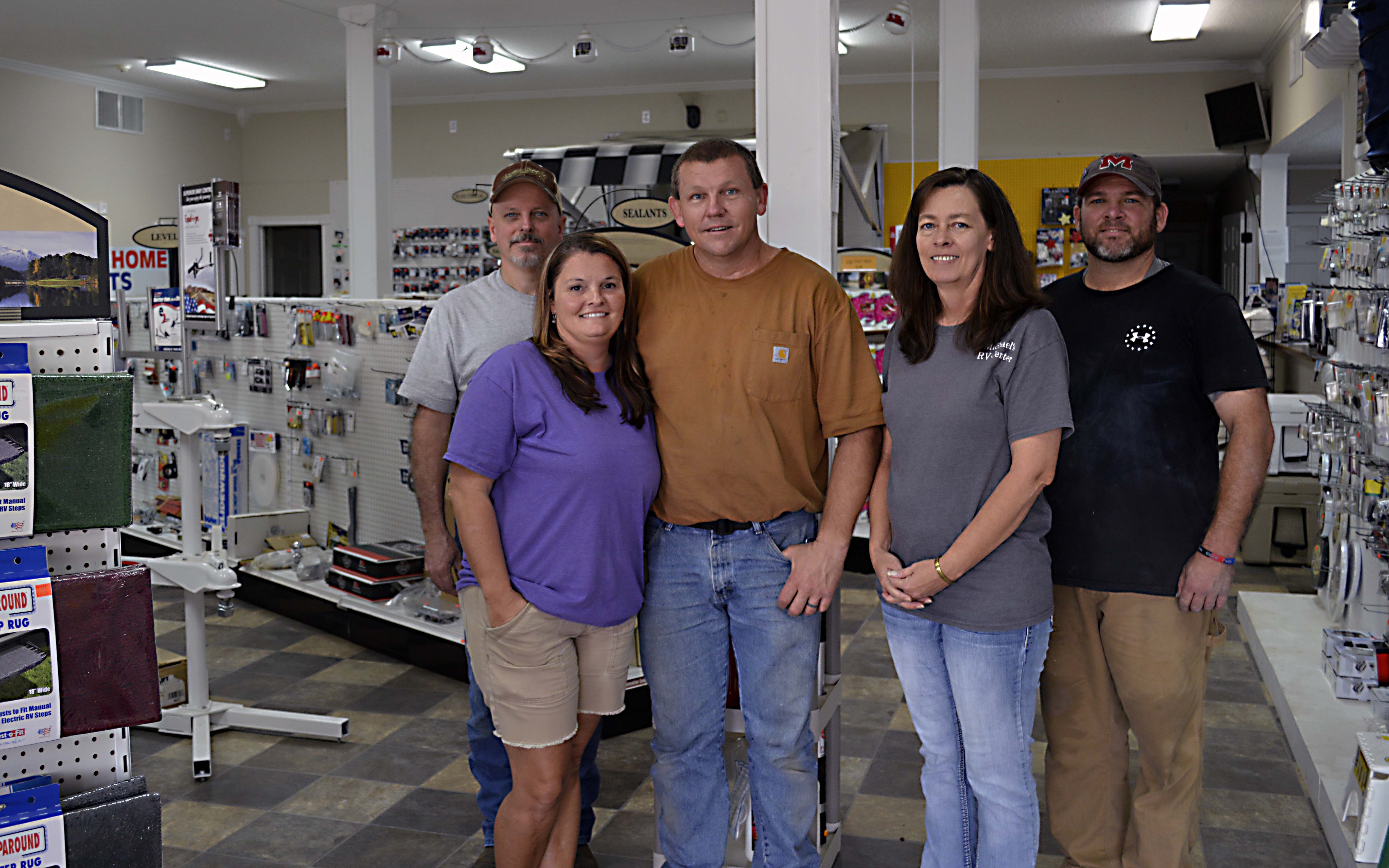 Pictured Above: From left, Mark Stafford, Angela and Grant McArthur, Jessica Blansett and Alan Doane stand in Michael’s RV Center. | Photo by Joshua Campbell