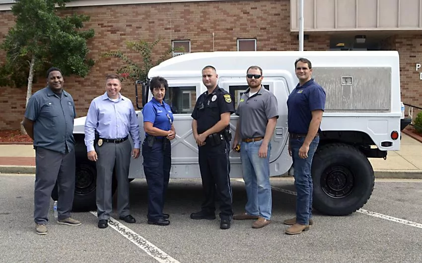 Pictured Above: Columbia police display their newest vehicle, a Humvee, Wednesday and thank those who made it possible. From left are Walter Brown, Chief Michael Kelly, Deputy Chief Rita Pickering, Logistics Officer Steven Palmer, Nik Ingram and Kristian Agoglia. | Photo by Mark Rogers