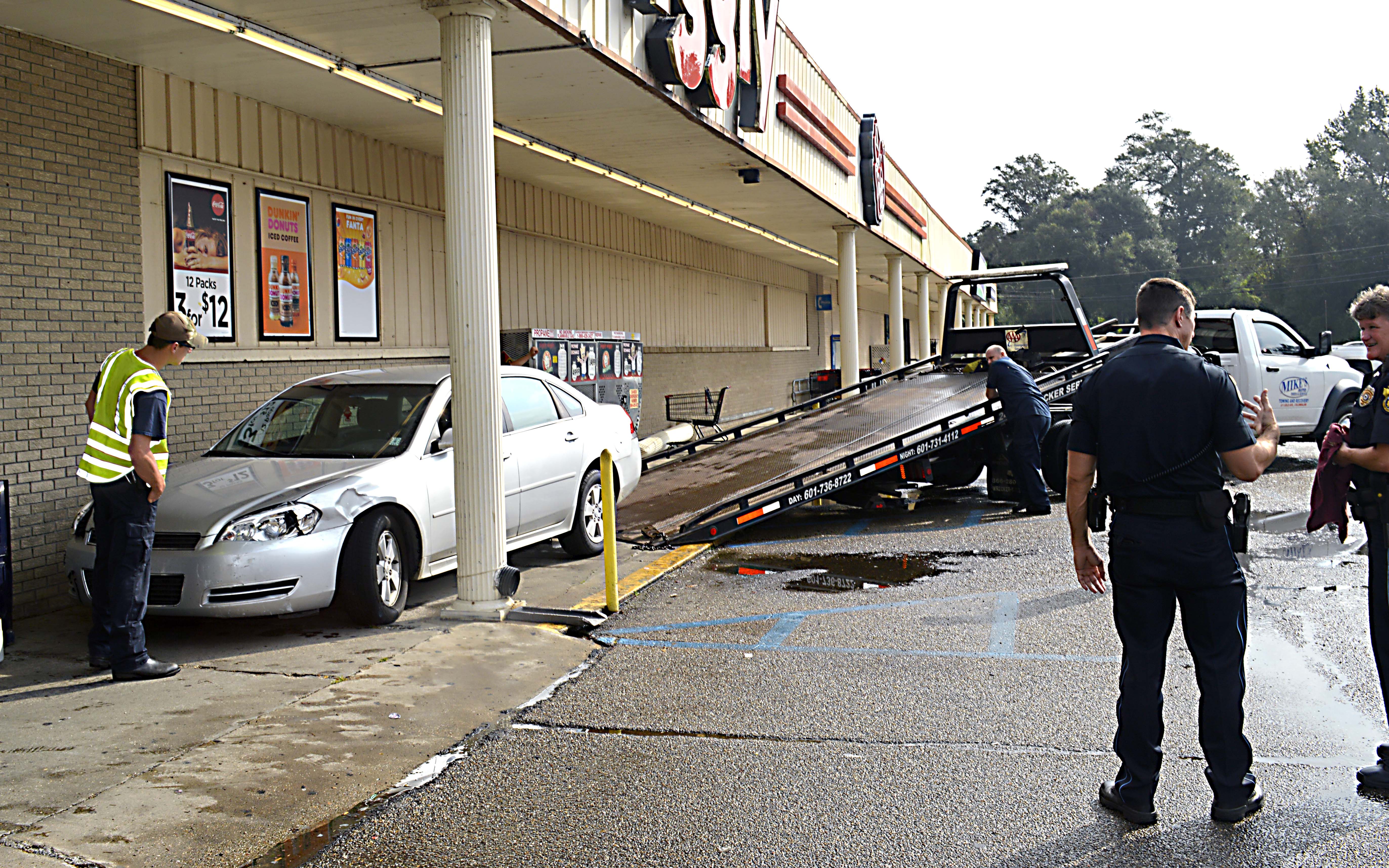 Pictured Above: Tow truck operators prepare to load up a car after it crashed through a support column at the Piggly Wiggly on Mississippi 13 Tuesday morning. The elderly driver told police she accidentally hit the gas instead of the brake. | Photo by Joshua Campbell