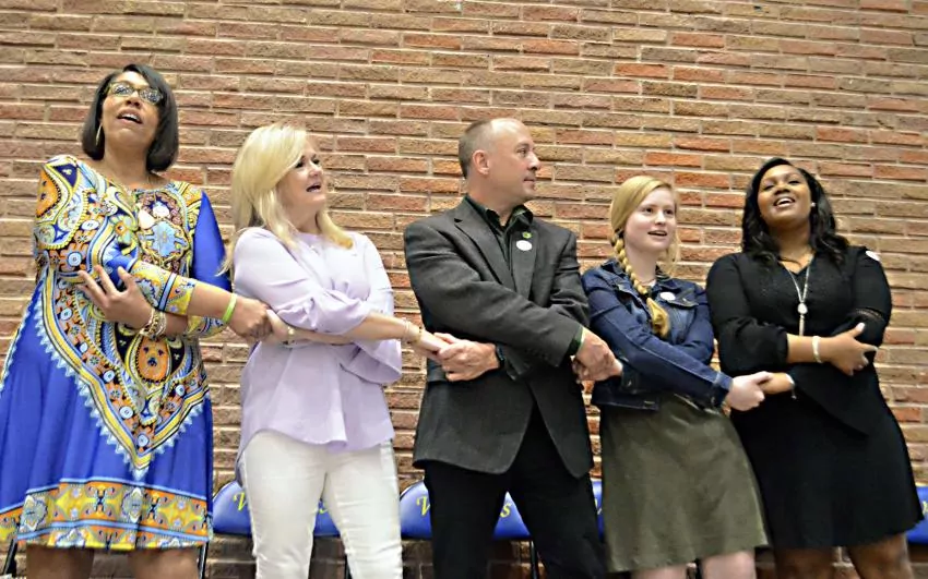 Pictured Above: Columbia High School Principal Sheila Burbridge, SAVE Advisor Toni Floyd, Mark Barden, co-founder of the Sandy Hook Promise, SAVE Secretary Lindsey Sumrall and SAVE Vice President Kori Miles hold hands as they sing the CHS Alma Mater at the end of Wednesday’s presentation. | Photo by Mark Rogers