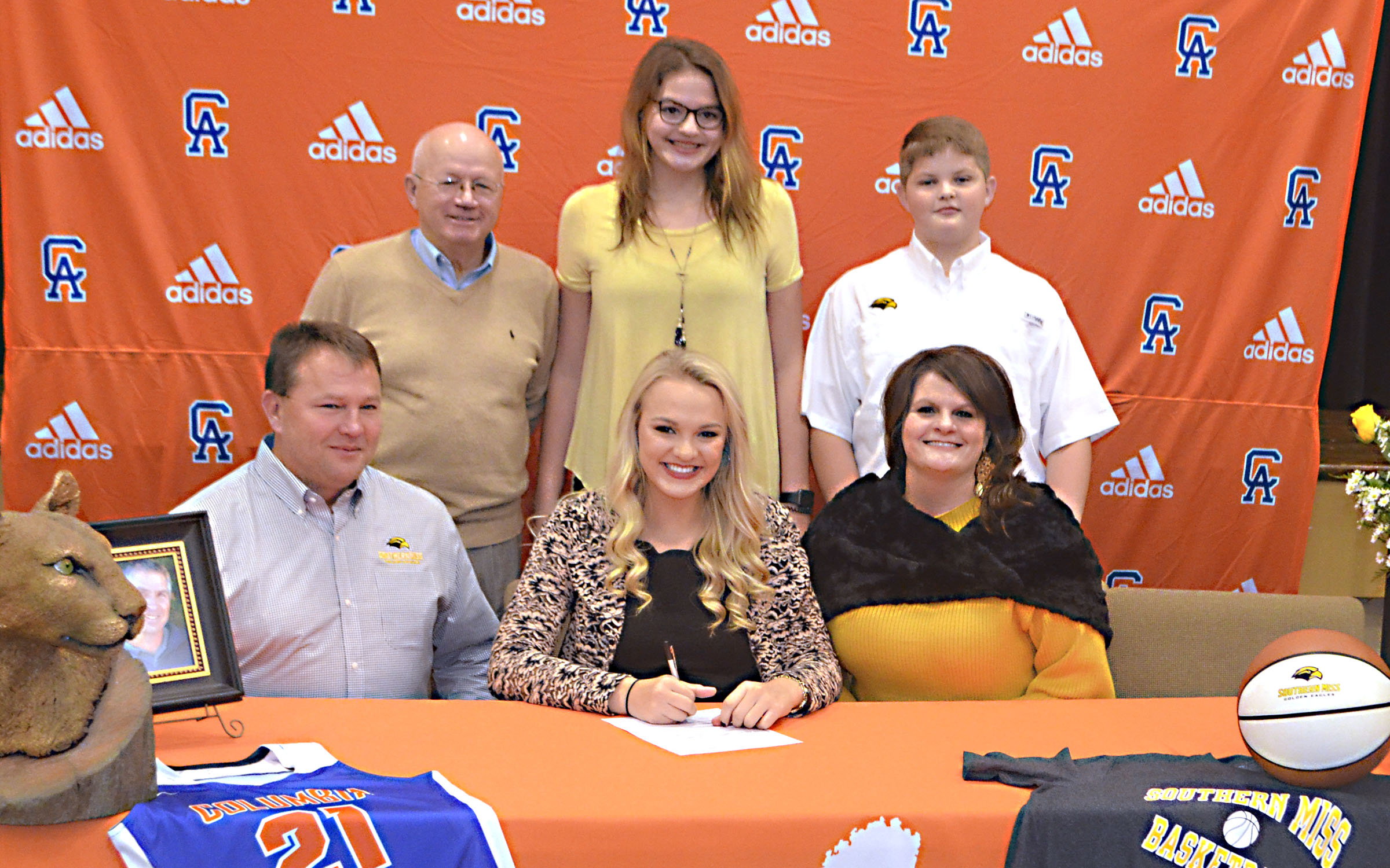 Pictured Above: Morgan Jones was surrounded by her family and coach Wednesday as she signed her letter of intent to play at the University of Southern Mississippi next year. In front, from left, are her father, Steve Jones, Jones, and her mother, Lisa Jones. In back, from left, are CA coach Dale Watts, Macey Jones and Jackson Jones. | Photo by Mark Rogers