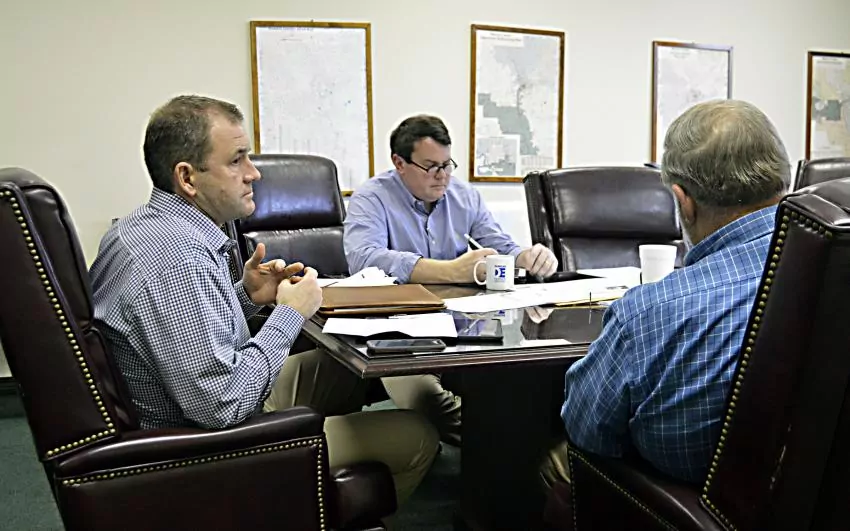 Pictured Above: County Engineer Jeff Dungan, left, meets with the Board of Supervisors Tuesday. A combination of a $3 million bond issue and state emergency bridge funds have helped address the county’s bridge crisis. | Photo by Joshua Campbell