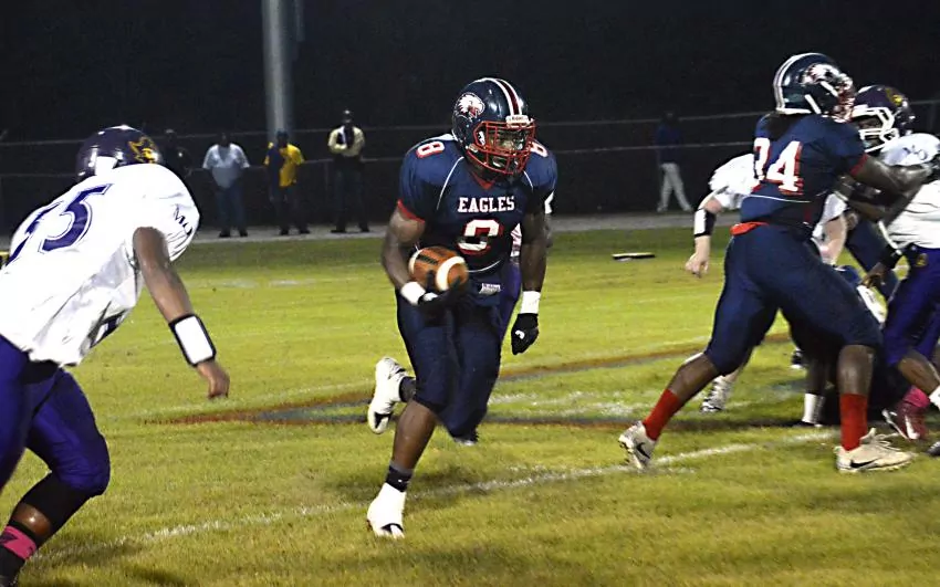 Pictured Above: East Marion running back Jarveon Howard gains yardage last season against Mount Olive. | Photo by Joshua Campbell