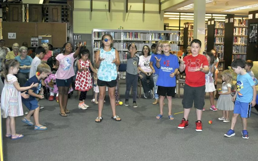 Pictured Above: Children attending the event learn how to juggle. On Tuesday comedian Wink Daneberg entertained the young and old alike at the Columbia-Marion County Library. | Photo by Susan Amundson