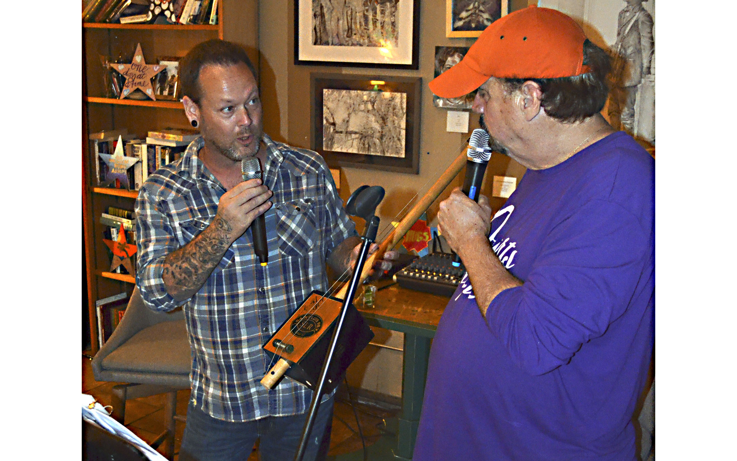 Pictured Above: Mark Carithers, left, shows off an auction item as Carlton Thornhill does his live broadcast to fundraise for hurricane victims for Hearts of Hope Oct. 23. | Photo by Mark Rogers