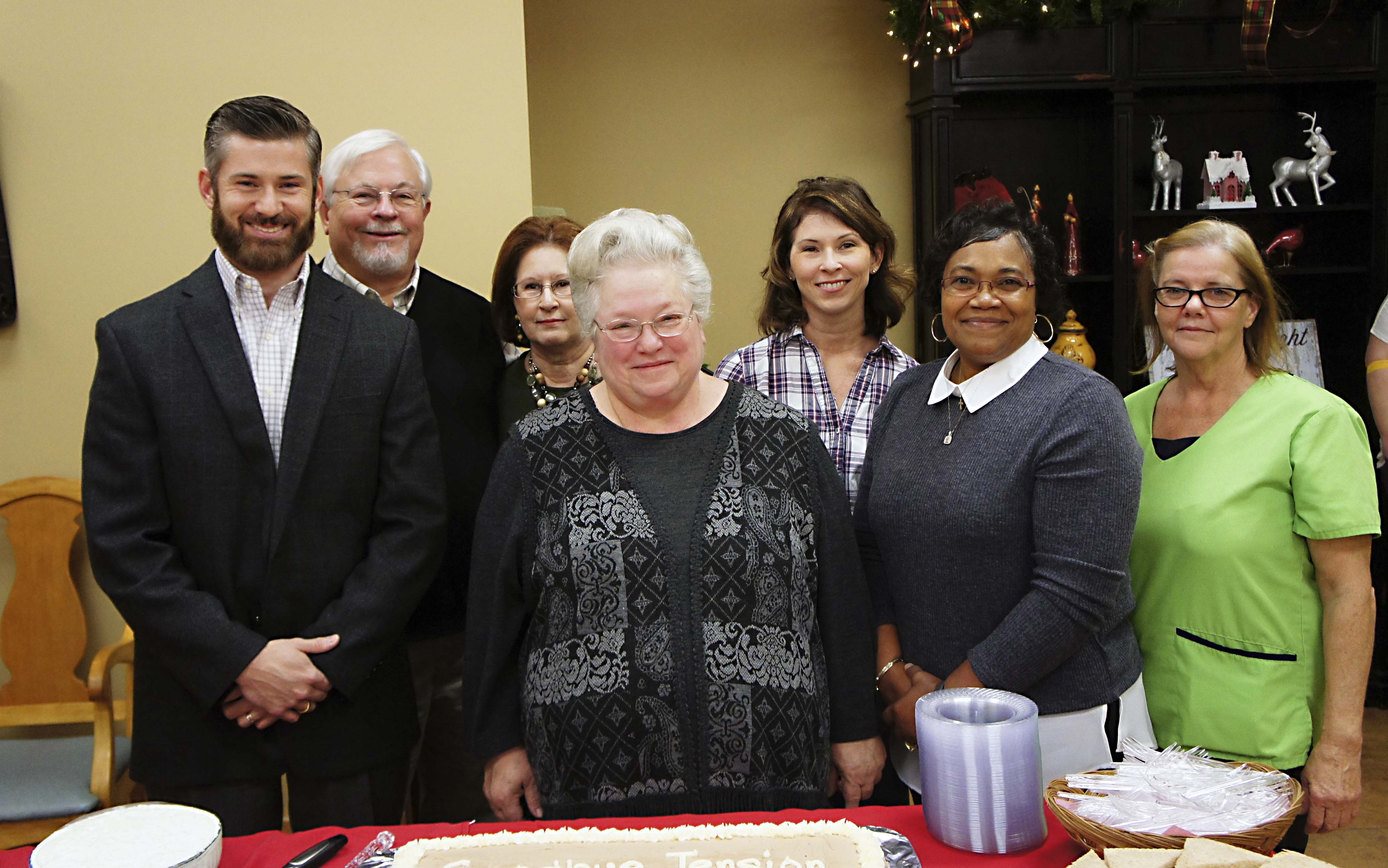 Pictured Above: Management from The Grove honors longtime employee Gail Green during a retirement celebration Tuesday at the Columbia nursing facility. Green has worked there for 31 years heading up the kitchen. From left are Michael Bradshaw, Jack Bradshaw, Becky Bradshaw, Gail Green, Stephanie Herzig, Anna Evans and Jan McCain. | Photo by Charlie Smith