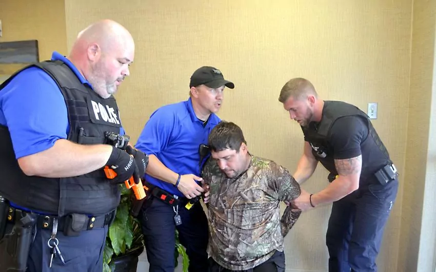 Pictured Above: Constable Robbie Gill, portraying a shooter at Marion General Hospital, is taken into custody by Columbia Police Department officers Justin Corley, Chris Bush and Ryan Williams Wednesday. | Photo by Mark Rogers