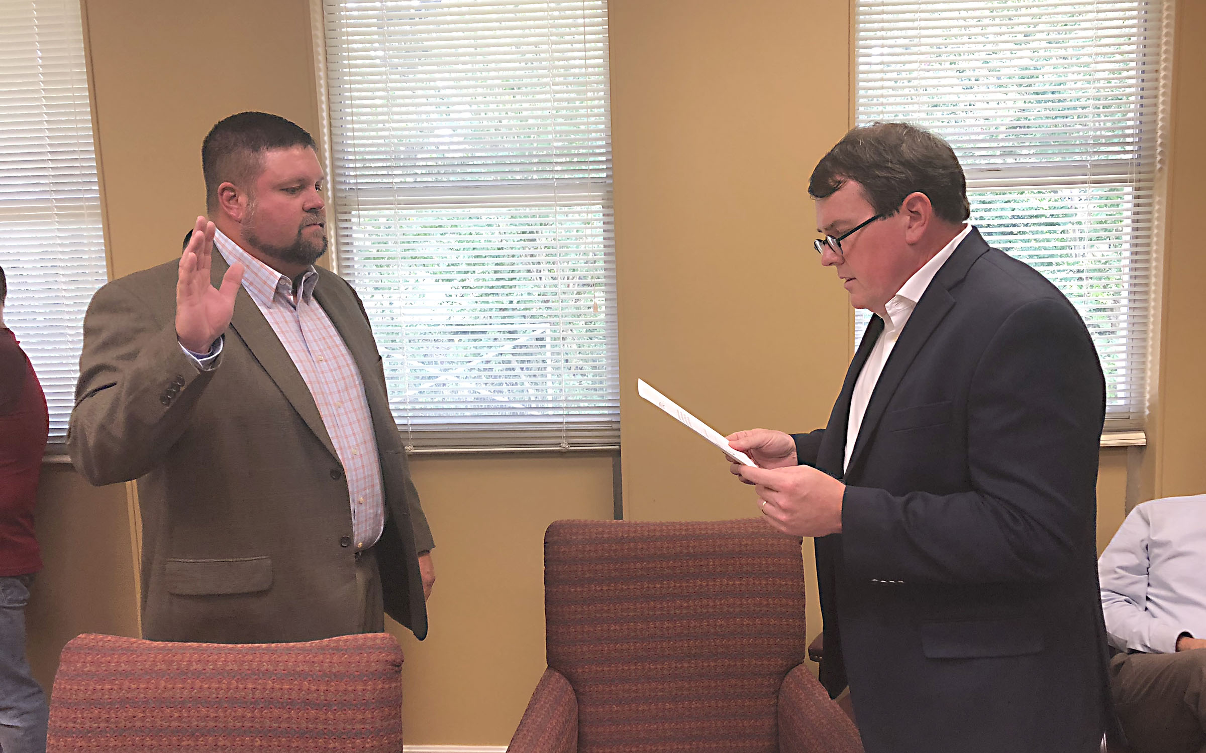 Pictured Above: Columbia School Board Member Eric Lucas takes the oath of office Aug. 9 from Attorney Drew Foxworth. | Photo by Mark Rogers