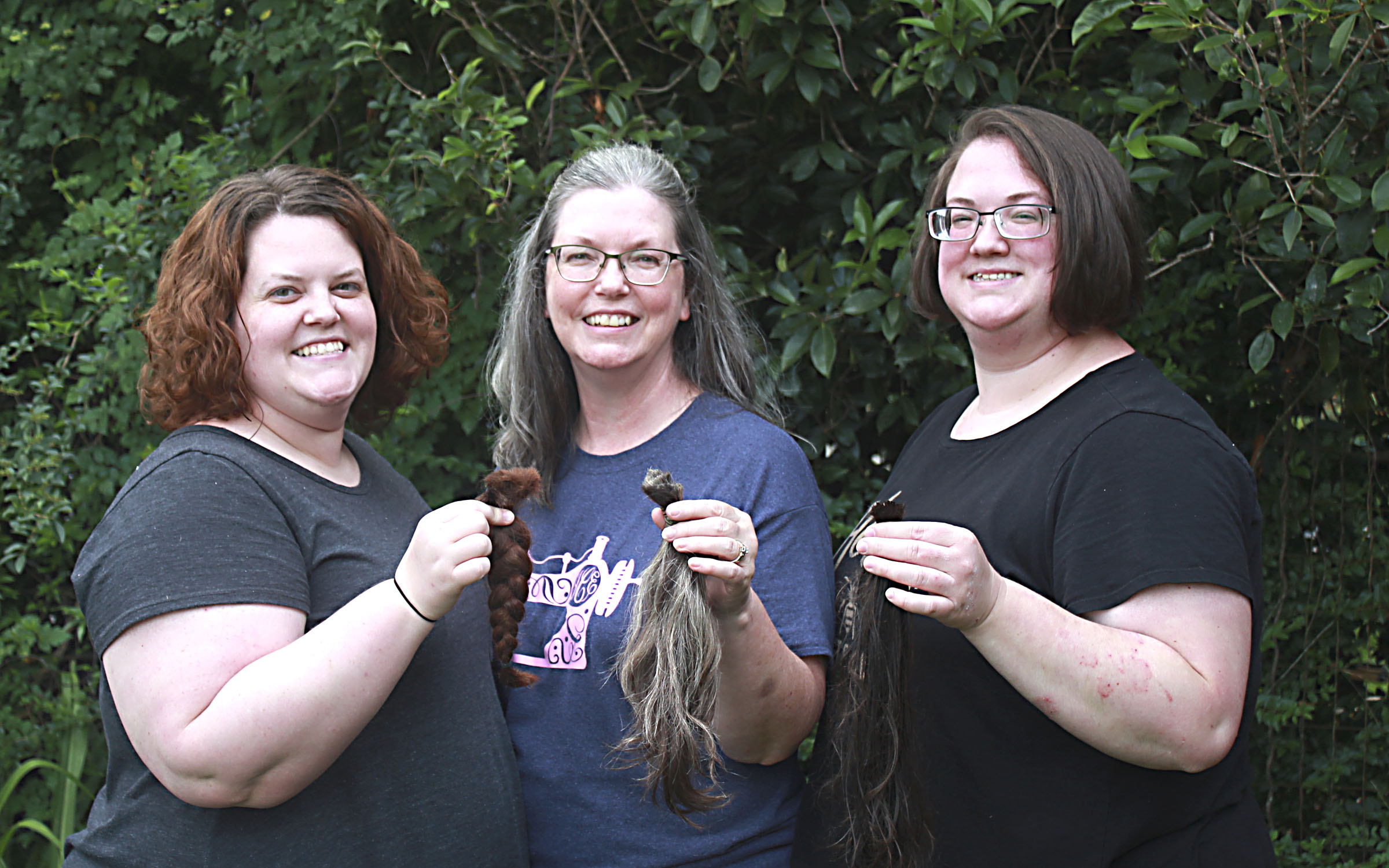 Pictured Above: From left, Annie Martin, Jo Ellen Carr and Sidney Martin holds the pieces of their hair that they donated to Wigs for Kids, a charity that helps children going through cancer treatments or other illnesses that cause hair loss. | Photo Submitted