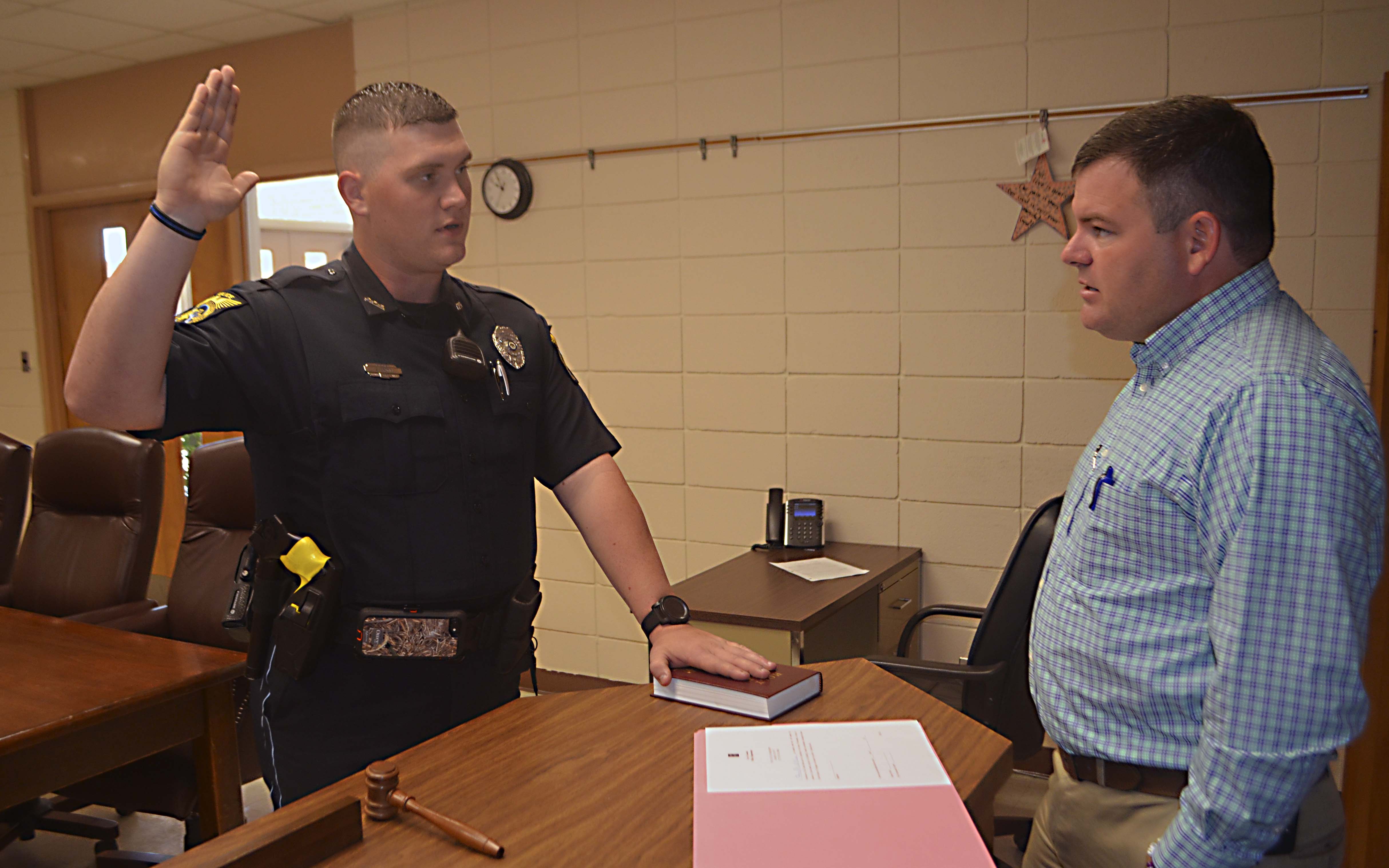 Pictured Above: Shane Brown takes his oath to serve as a Columbia Police Department Officer Tuesday from Mayor Justin McKenzie at City Hall. | Photo by Mark Rogers