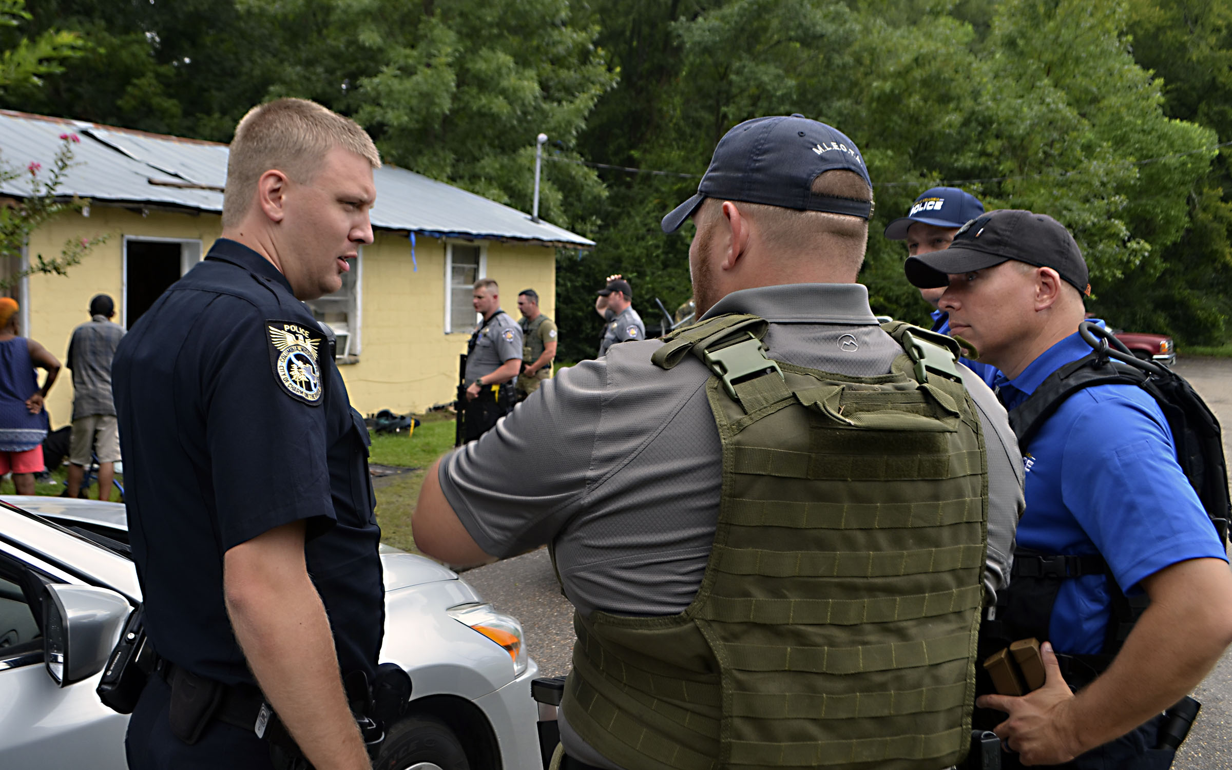 Pictured Above: Columbia police officers, from left, Jonathon Martin, Sgt. Nate Cook and Chief Michael Kelly discuss the next move as deputies and officers worked Friday serving warrants and recovering stolen property across the city. | Photo by Mark Rogers
