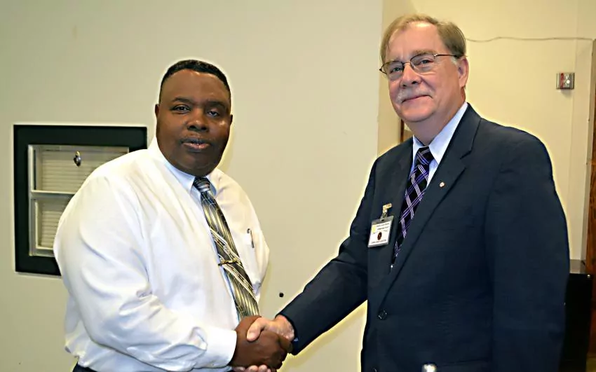Pictured Above: Warden Derek Mingo of the Marion County Regional Correctional Facility shakes hands with John Sargent of the American Correctional Association Wednesday following an announcement about the prison’s good performance in an audit. | Photo by Mark Rogers