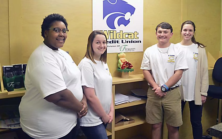 Pictured Above: Anna Cooper, second from left, enjoys working with Wildcat Credit Union student employees, from left, Caitlin Magee, Cole Pearson and Elizabeth Sanford. | Photo by Joshua Campbell